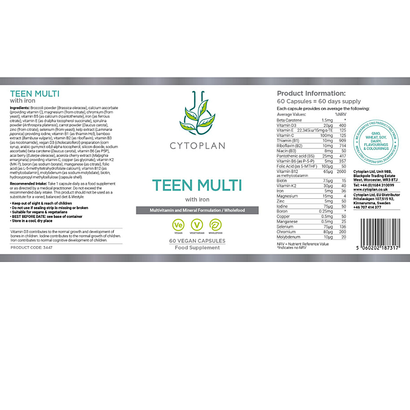 Cytoplan Multivitamín pre teenagerov je komplexná zmes vitamínov, minerálov a rastlinných zložiek navrhnutá pre potreby dospievajúcich. Obsahuje bioaktívne formy živín vrátane kyseliny listovej, vitamínu B12 a vitamínu B6, ako aj dobre vstrebateľné železo. Zmes fytonutrientov z brokolice, mrkvy, spiruliny, aceroly a acai poskytuje ďalšie mikroživiny pochádzajúce z rastlinných zdrojov. Prípravok je vhodný pre aktívnych a vyťažených tínedžerov, ktorí potrebujú pravidelné doplnenie vybraných vitamínov a minerálov. Jednoduchý spôsob, ako zaradiť kvalitné živiny do každodenného režimu dospievajúceho.