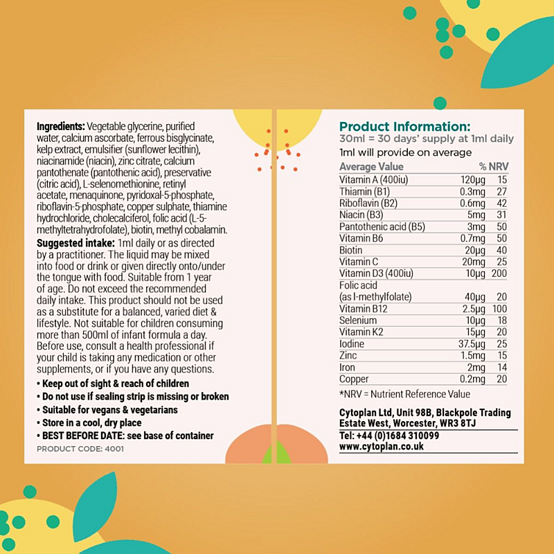 Cytoplan Tekutý multivitamín pre deti je navrhnutý pre malé deti vo veku 1–5 rokov. Obsahuje dôležité vitamíny a minerály, ako vitamíny A, C, D, železo a zinok, ktoré dopĺňajú denný príjem mikroživín. Využíva dobre vstrebateľné formy živín, napríklad L-metylfolát vápenatý a metylkobalamín. Tekutá forma zabezpečuje jednoduché podávanie priamo na jazyk alebo primiešaním do jedla či nápoja. Kvapky majú prirodzenú chuť bez umelých aróm a farbív. Praktické riešenie pre rodičov, ktorí chcú jednoducho doplniť vybrané vitamíny a minerály do každodennej stravy dieťaťa.