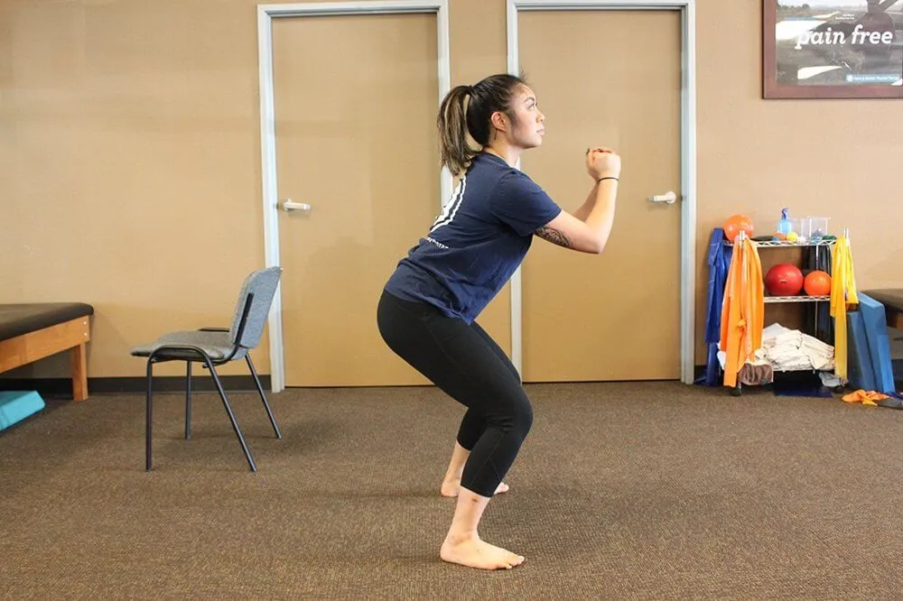- Pomaly spúšťajte boky smerom nadol, akoby ste si chceli sadnúť na stoličku.