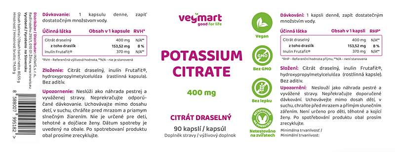 Produkt Vegmart Draslík 400 mg navyše obsahuje aktívnu látku Inulín Frutafit®, čo je prírodná vláknina, ktorá je známa tým, že podporuje trávenie, zlepšuje vstrebávanie živín, vrátane minerálov ako draslík a teda vaše telo bude môcť využiť doplnok s draslíkom naplno.