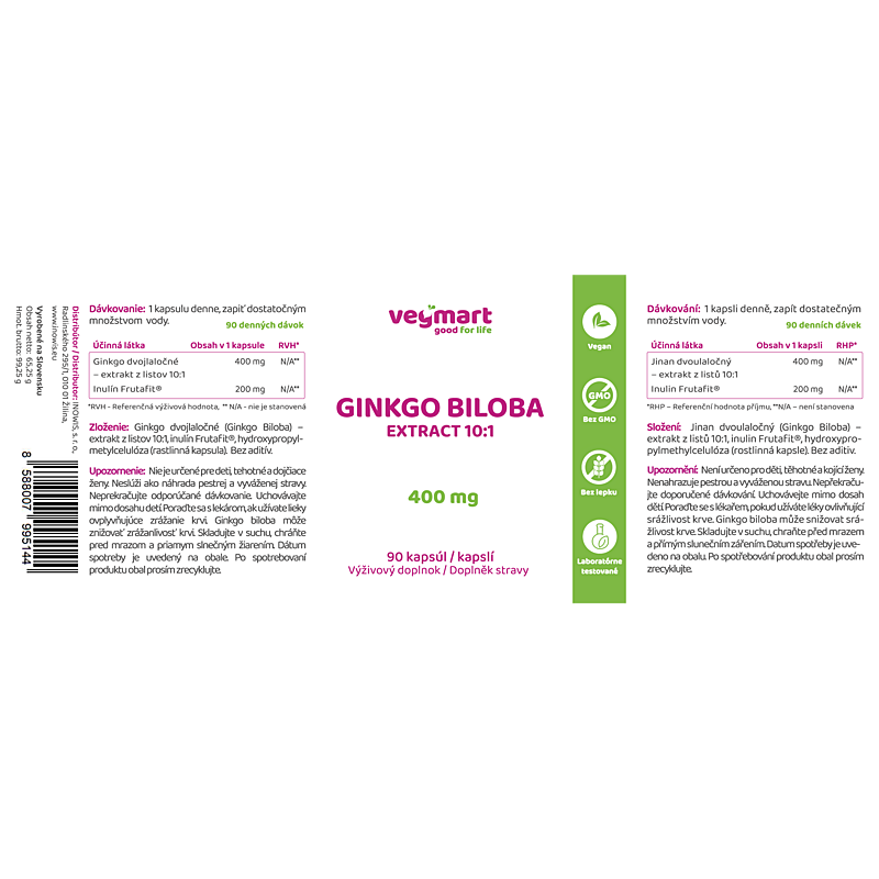 Ginkgo Biloba 400 mg, 90 kapsúl je výživový doplnok z portfólia našej značky Vegmart. Ponúkame vám čisté, 100% vegánske doplnky výživy z kvalitných surovín a vysokým obsahom účinných látok, bez zbytočných aditív. Vegmart - good for life.