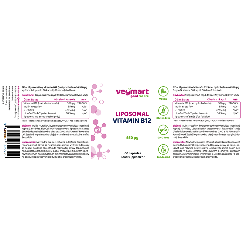 Vegmart Lipozomálny vitamín B12 (metylkobalamín) 550 µg, 60 kapsúl je výživový doplnok z portfólia našej značky Vegmart. Našou filozofiou je ponúkať vám čisté, 100 % vegánske doplnky výživy vyrobené z kvalitných surovín a s vysokým obsahom účinných látok, bez zbytočných aditív. Vegmart – good for life.