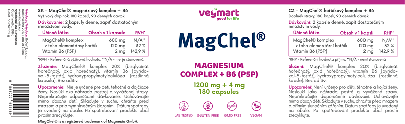 MagChel® (kombinácia magnézium bisglycinátu a oxidu horečnatého) je vysoko vstrebateľná forma horčíka viazaná na aminokyselinu glycín. Vhodný na doplnenie dennej potreby horčíka v organizme. Šetrný k tráviacemu traktu. Vegmart ponúka MagChel® v kombinácii s vitamínom B6 v praktických kapsulách s obsahom 600 mg horčíkovej zmesi (MagChel® a oxid horečnatý), z toho 120 mg elementárneho horčíka. Bez zbytočných prídavných látok. Vhodné aj pre vegetariánov a vegánov.