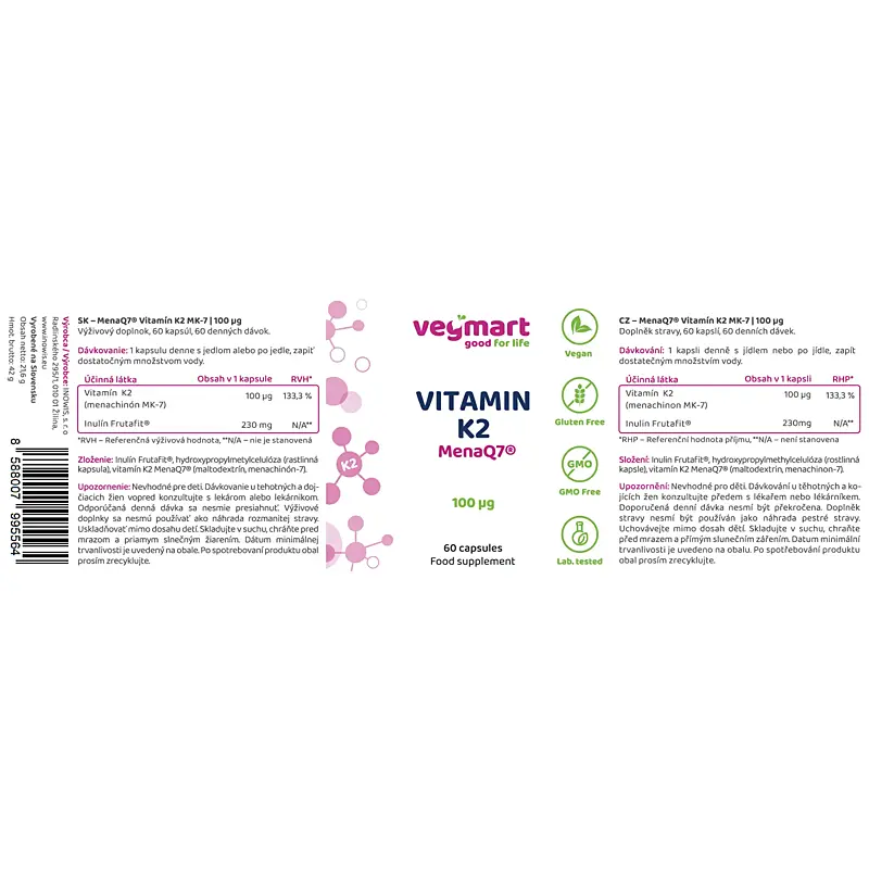 - Obsahuje 100 μg vysoko vstrebateľnej formy vitamínu K2 (menachinón-7, MK-7) vo forme MenaQ7® – najviac klinicky preskúmanej a patentovanej prírodnej formy vitamínu K2.